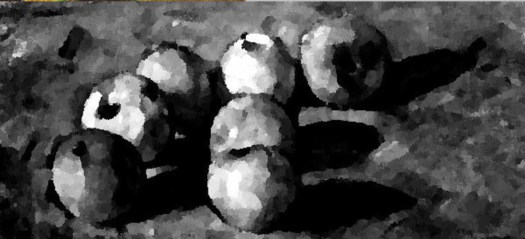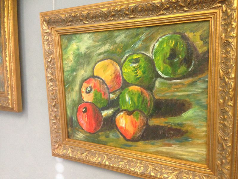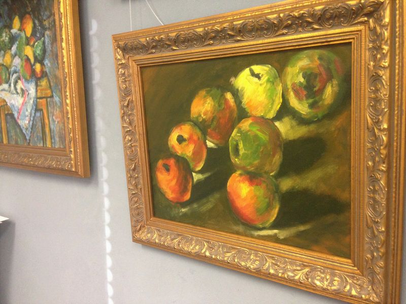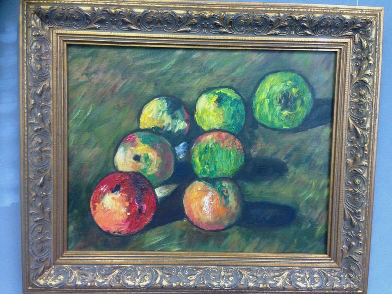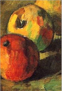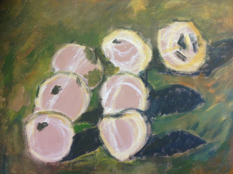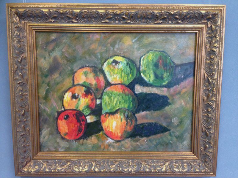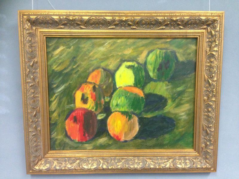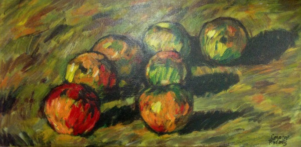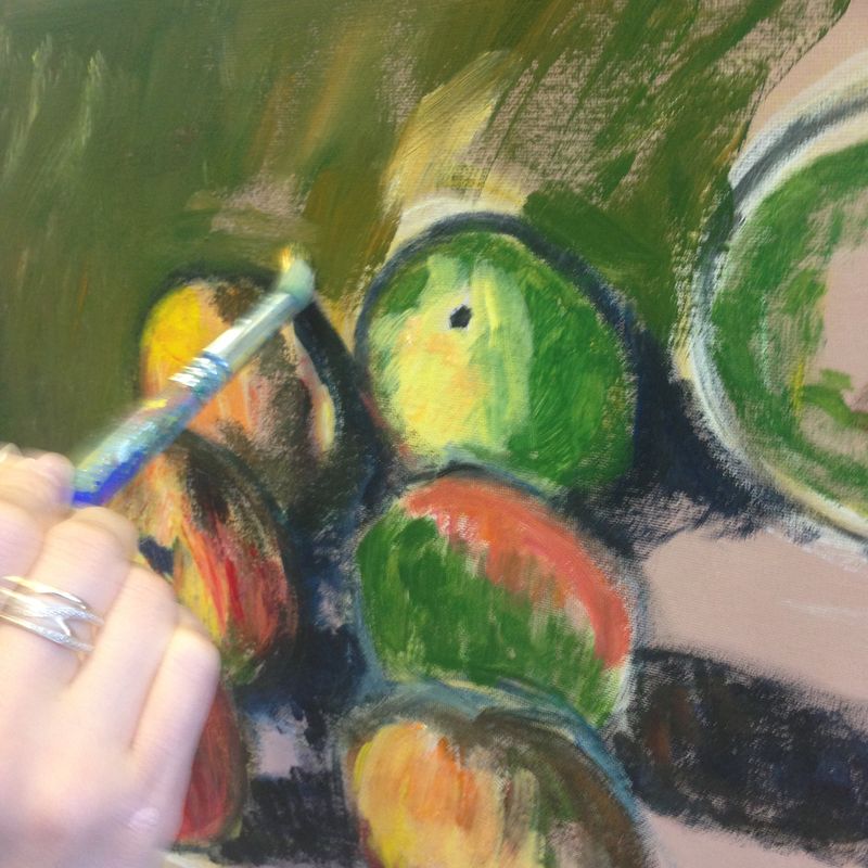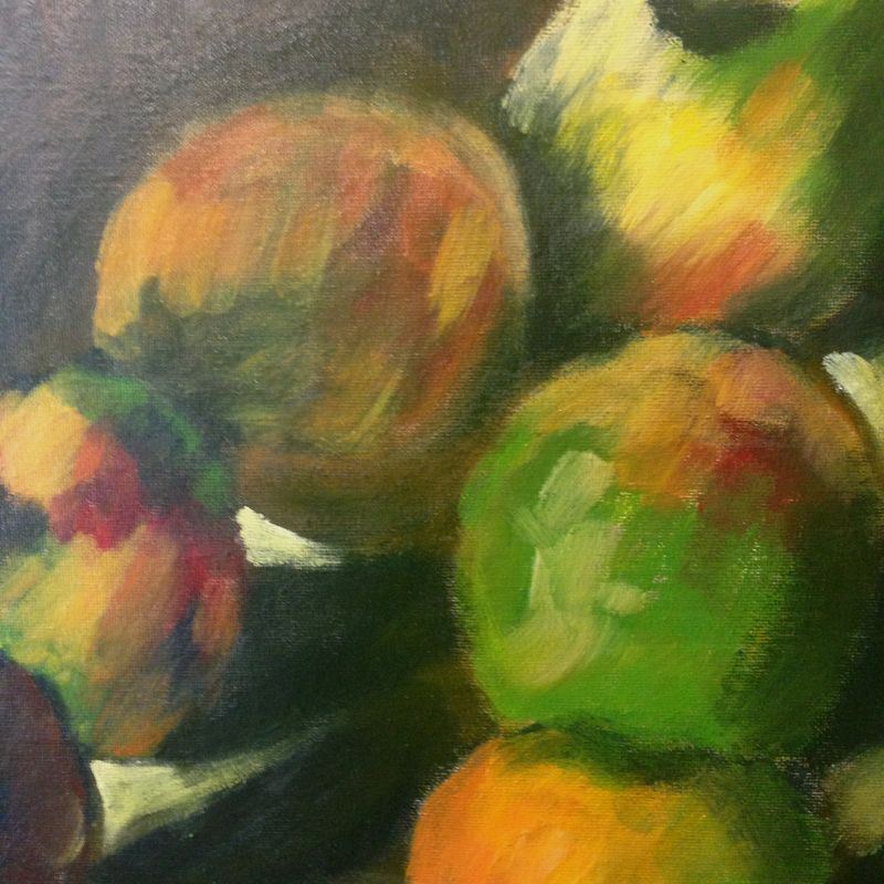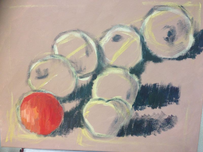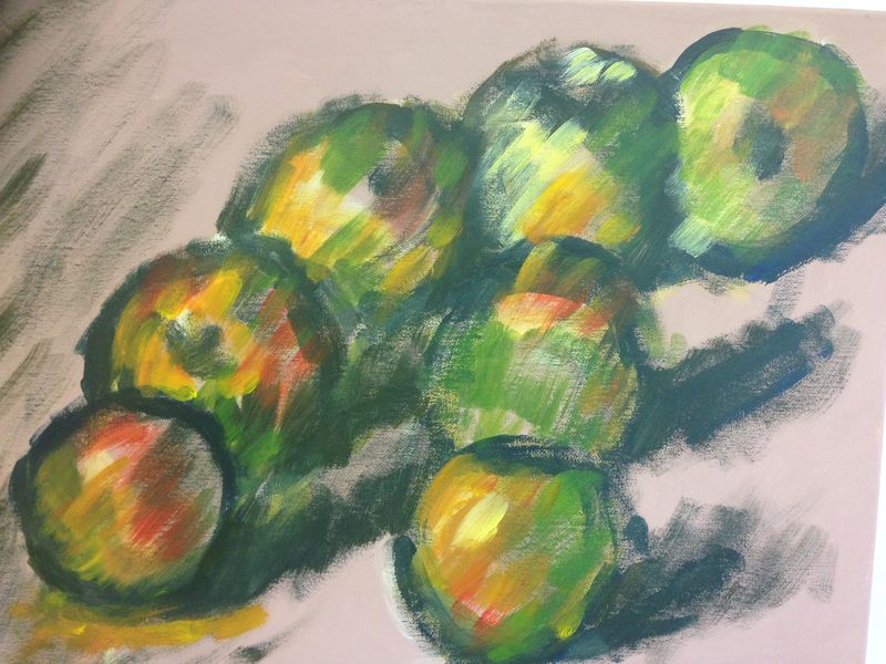 Tina's apples displayed soft, blended textures. She later overlaid some constructivist Cezanne strokes with impasto.