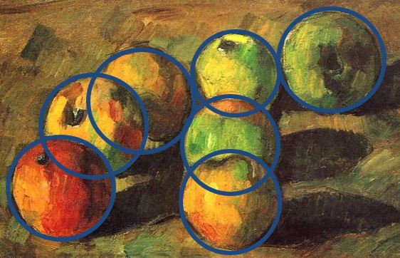 Cezanne places seven almost identical objects into a composition which may be thought to represent the fundamental scale of Western Music.
