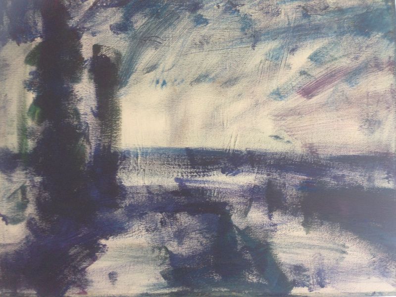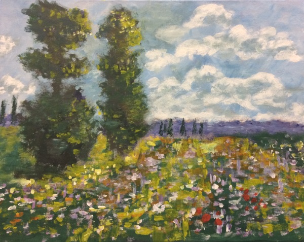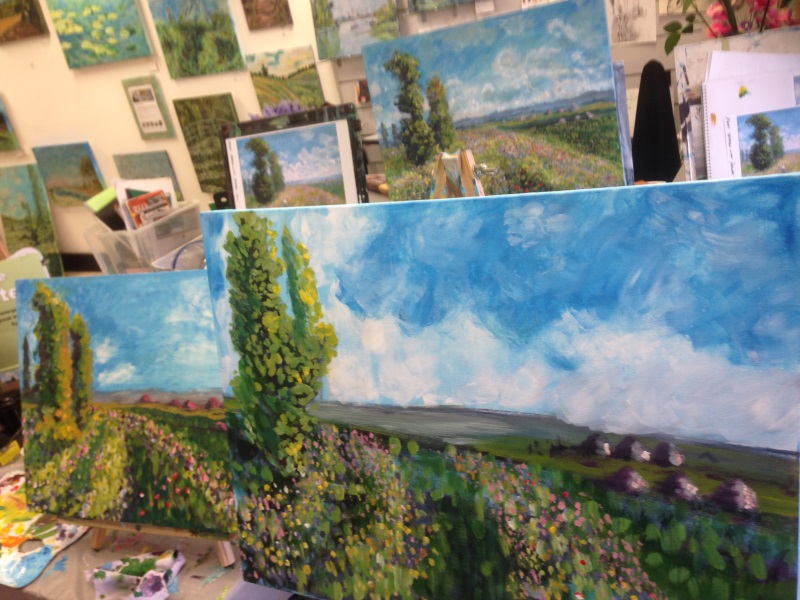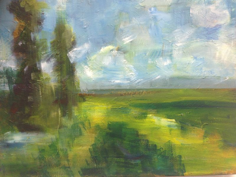 In this painting we get the opportunity to practice the relaxed arm technique which enables the rapid painting of hundreds of vertical strokes. This gives the effect of swaying grass flowing like a river through the fore and mid-ground.