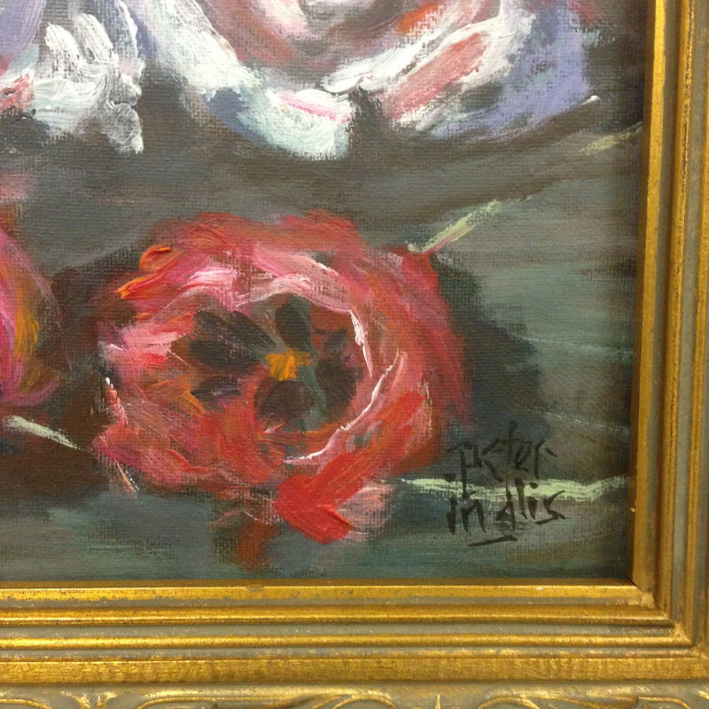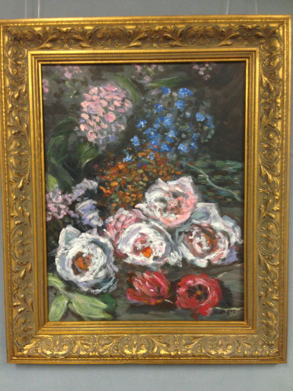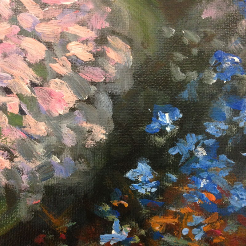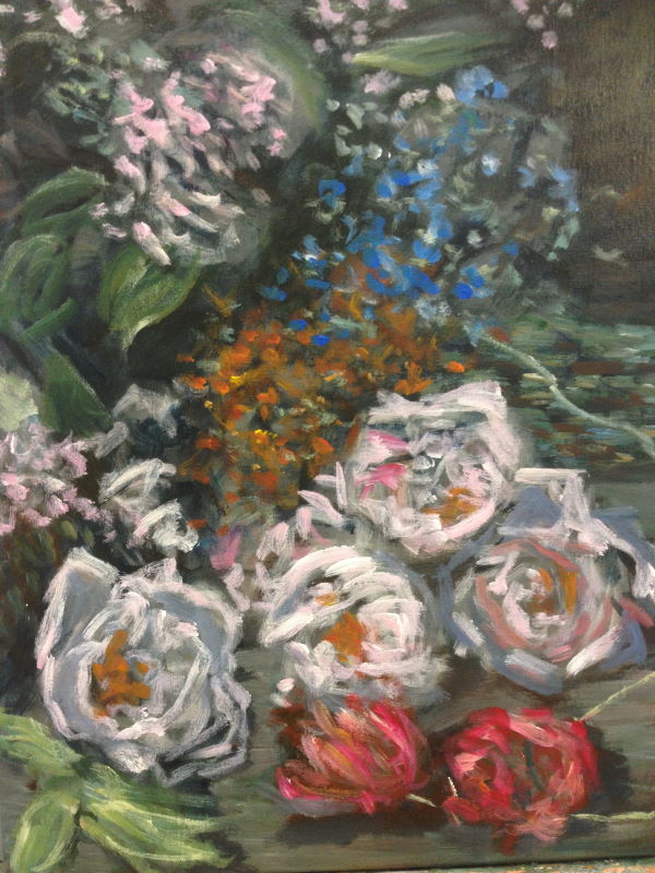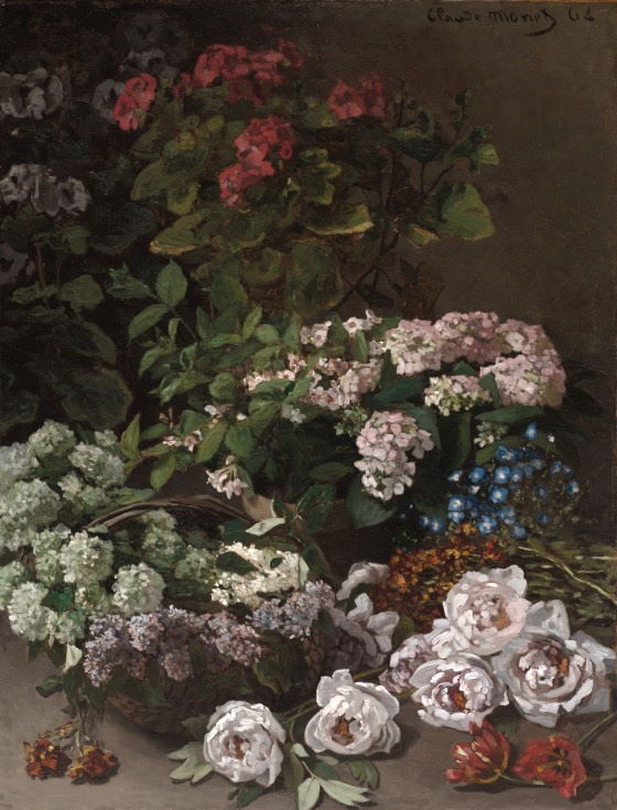 Isolated against a dark background, the fully mature peonies, potted hydrangeas, and basketed lilacs spill downward and outward from the geraniums at the rear. At the same time, Monet's energetic brushwork conveys the sparkling play of light on leaves and petals.