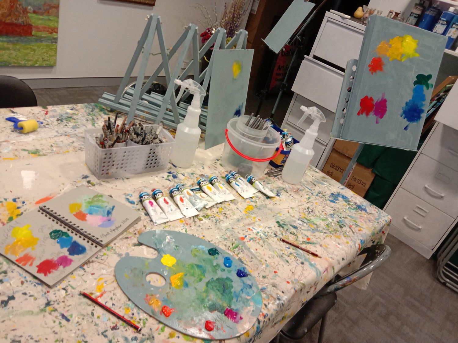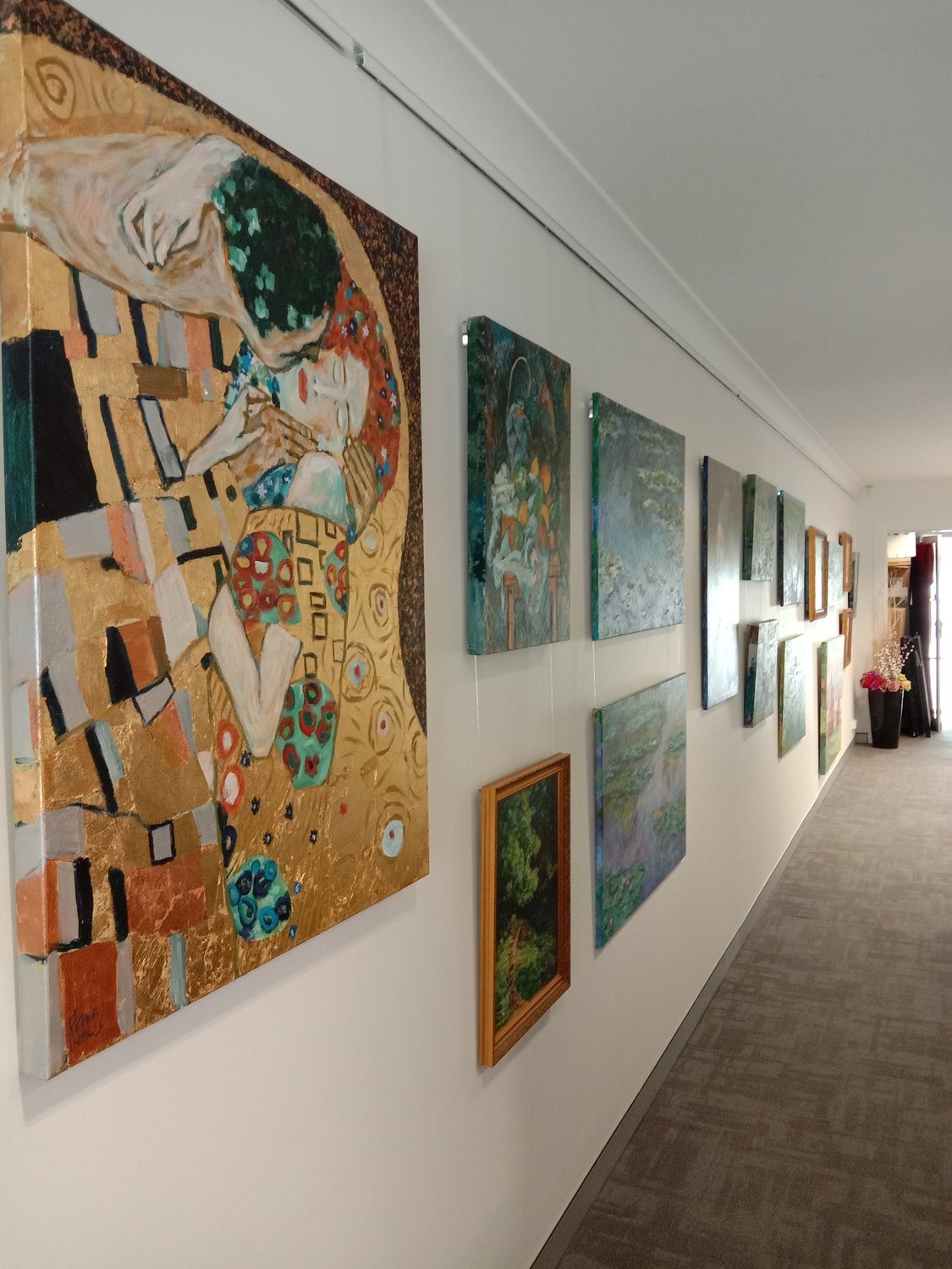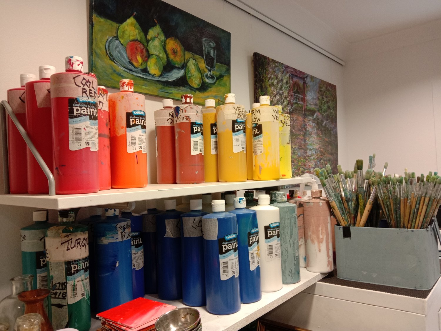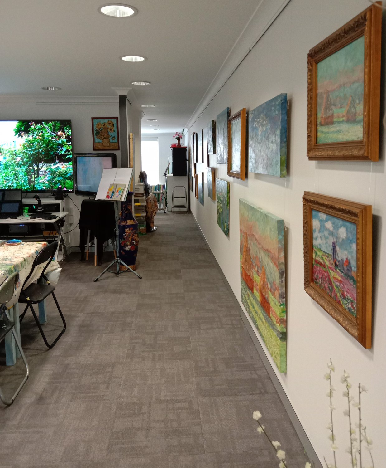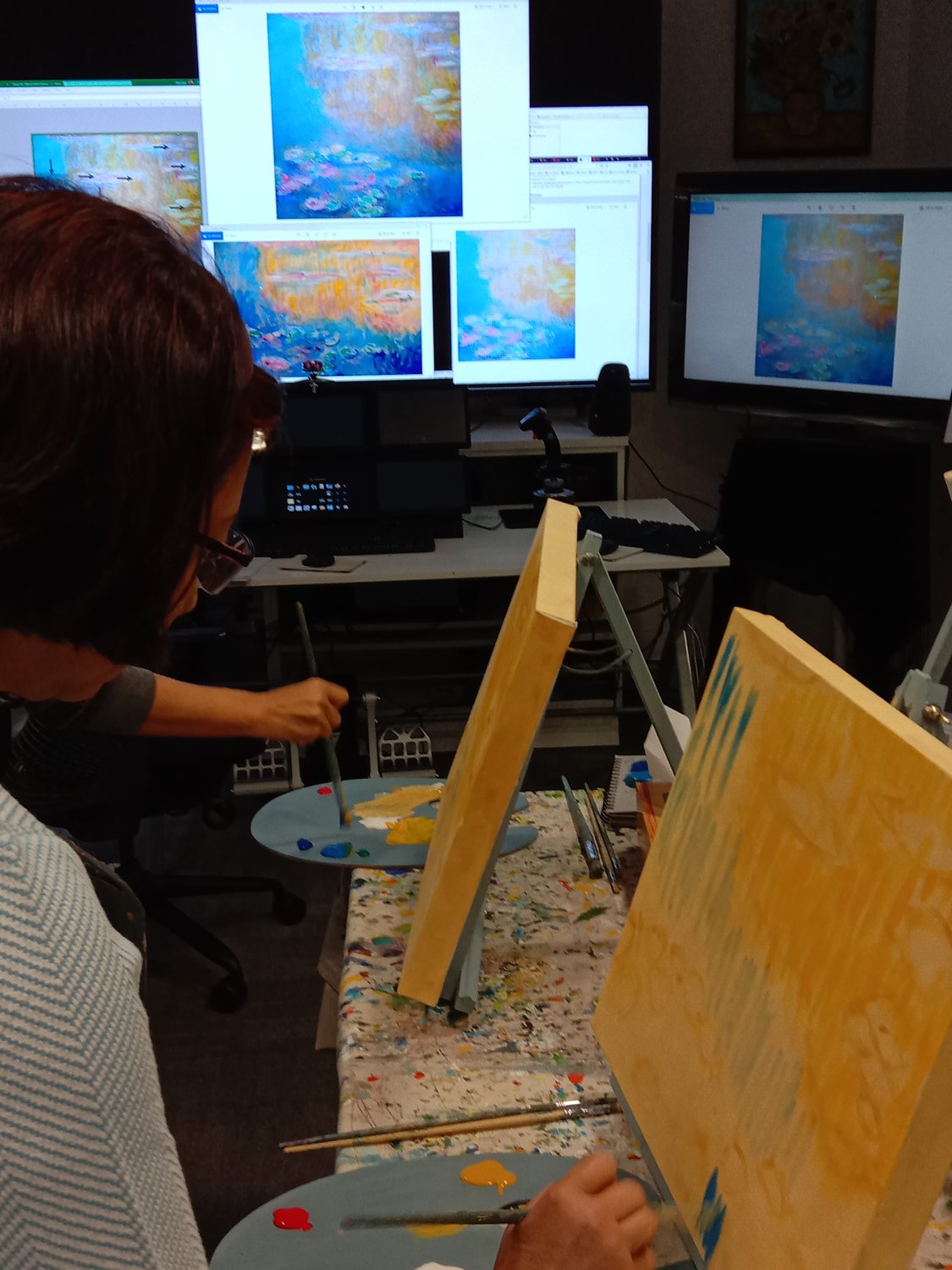 The well-lit studio uses an 85" and a 50" monitor to show details of the painting and course material.