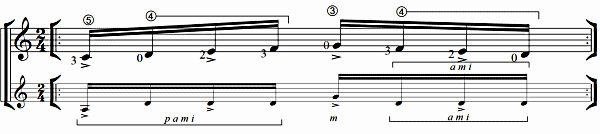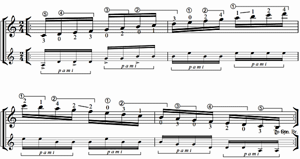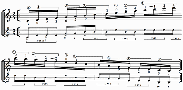 Here is the entire scale using the subsets of the tremelo fingering: p a m ia m i and m i.