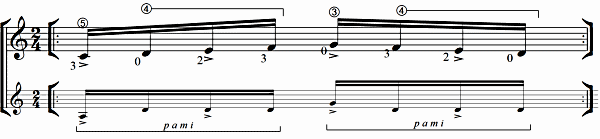 Here is the full tremolo fingering applied to the first 5 notes of a C major scale. Once you have worked out the right hand fingering practice it separately from the left hand as shown to make the right hand pattern absolutely clear in your mind.